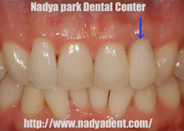 右の写真の青矢印が最終的なセラミック冠を被せたところです。