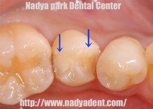 今回の上の写真は、セラミックの詰め物を削って型どりをする前の写真です。青矢印の部分を削ってあります。